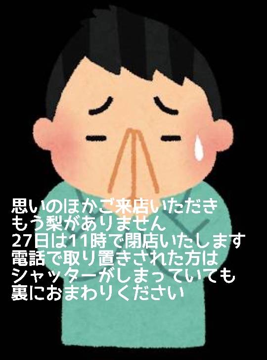 本日(27日)も、たくさんお買い上げいただきましたので11時閉店となりました。